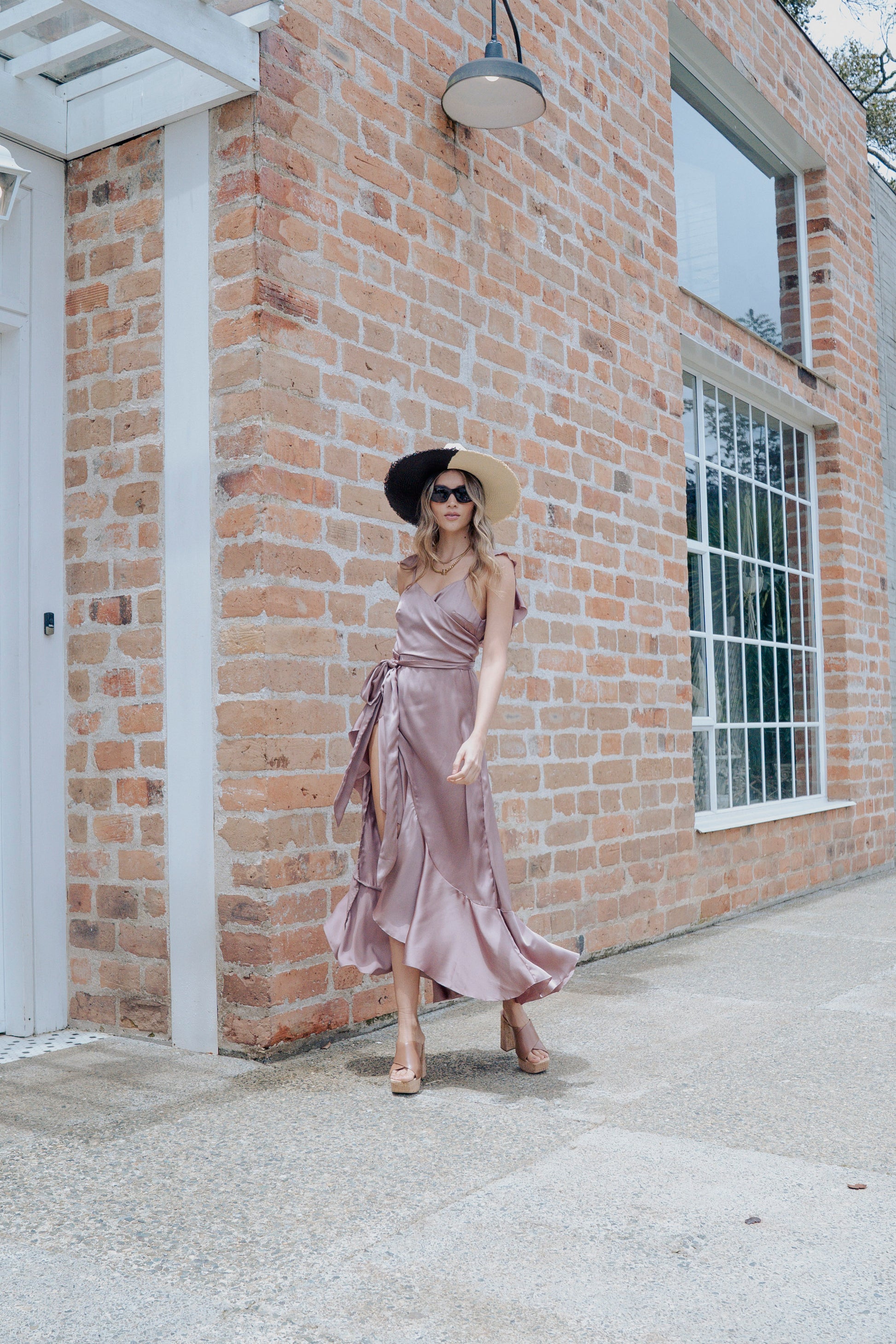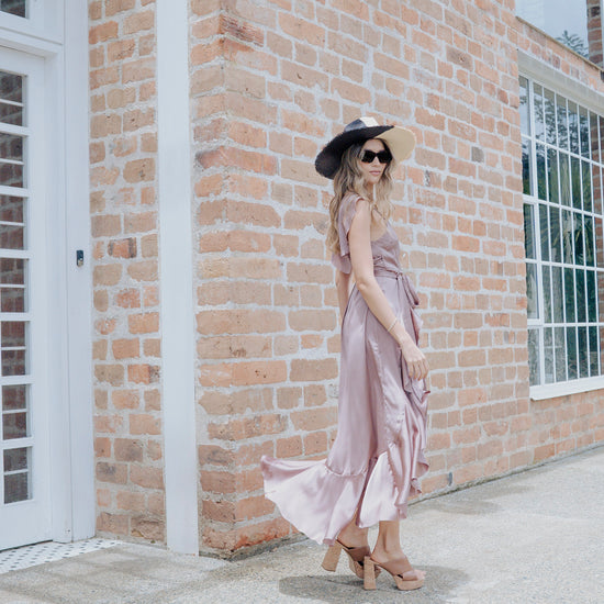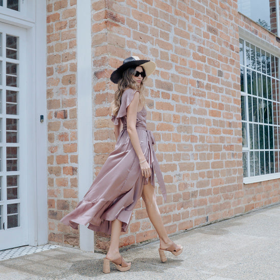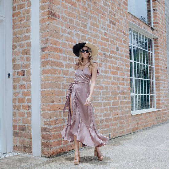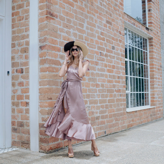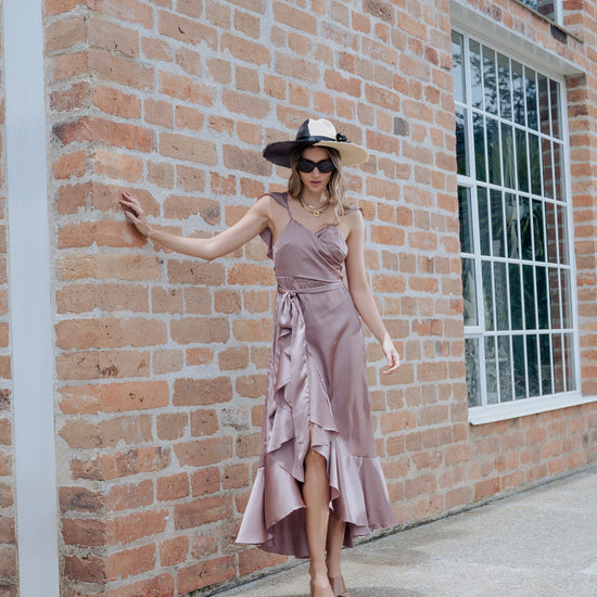 Gloria is a statement in movement. Made from breathable Mocca silk satin, this midi wrap dress features a flowing cape-style back and a waist tie that flatters every shape.